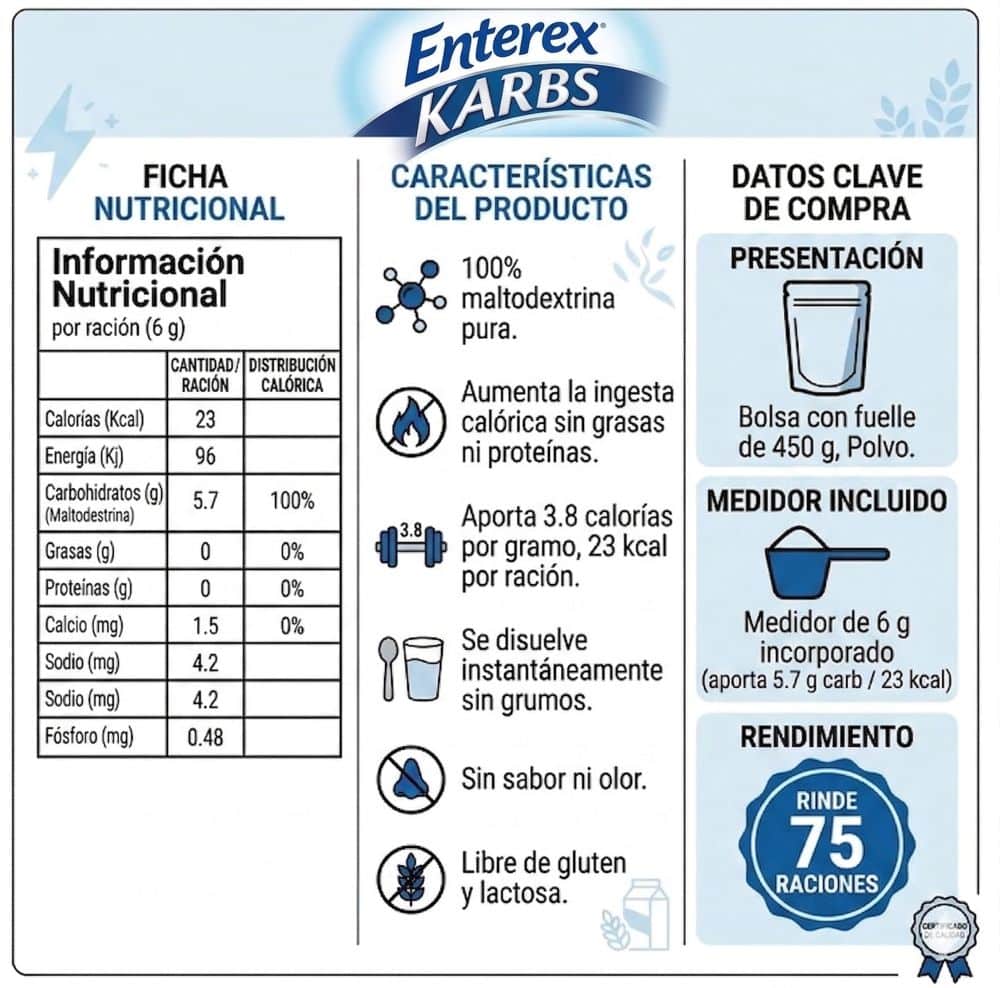 Indicaciones: Enterex® Karbs es un suplemento ideal para individuos que tienen necesidades calóricas aumentadas y/o para aquellos individuos que tienen dietas restringidas de proteína, grasas y electrolitos. Pacientes con enfermedad renal donde los requerimientos de proteínas se encuentran restringidos y debe completarse el aporte calórico a expensas de carbohidratos. Niños con ingesta calórica disminuida. Ancianos con ingesta calórica disminuida o restricción de líquidos en su alimentación, etc. Enterex® Karbs no constituye una dieta balanceada y no debe ser usada como única fuente de nutrición.